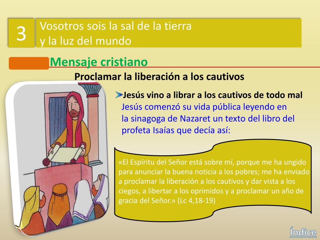 3 Vosotros sois la sal de la tierra y la luz del mundo Mensaje cristiano Proclamar la liberación a los cautivos Jesús vino a librar a los cautivos de todo mal Jesús comenzó su vida pública leyendo en lasinagoga de Nazaret un texto del libro del profeta Isaías que decía así: «El Espíritu del Señor está sobre mí, porque me ha ungido para anunciar la buena noticia a los pobres; me ha enviado a proclamar la liberación a los cautivos y dar vista a los ciegos, a libertar a los oprimidos y a proclamar un año de gracia del Señor.» (Lc 4,18-19) Índice