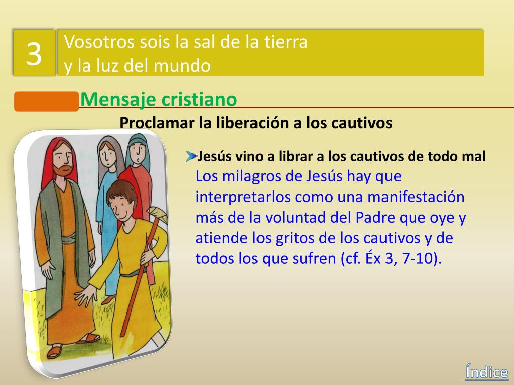 3 Vosotros sois la sal de la tierra y la luz del mundo Mensaje cristiano Proclamar la liberación a los cautivos Jesús vino a librar a los cautivos de todo mal Los milagros de Jesús hay que interpretarlos como una manifestación más de la voluntad del Padre que oye y atiende los gritos de los cautivos y de todos los que sufren (cf. Éx 3, 7-10). Índice