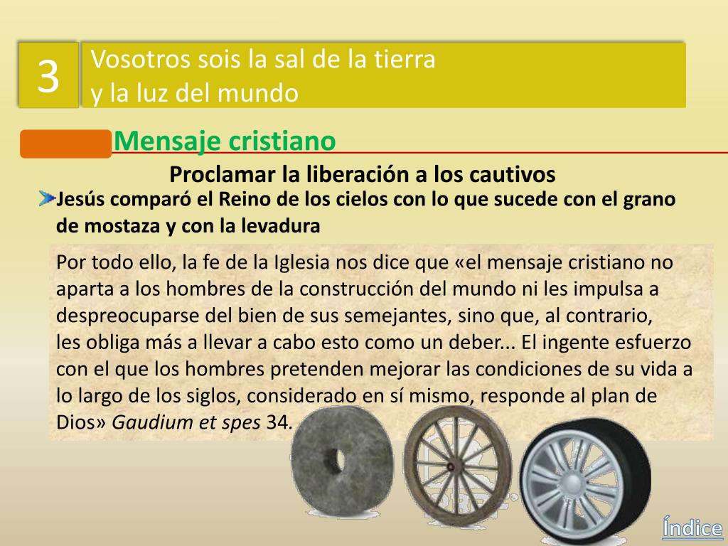 3 Vosotros sois la sal de la tierra y la luz del mundo Mensaje cristiano Proclamar la liberación a los cautivos Jesús comparó el Reino de los cielos con lo que sucede con el grano de mostaza y con la levadura «Sucede con el reino de los cielos lo que con un grano de mostaza que unhombre toma y siembra en su campo. Es la más pequeña de todas lassemillas, pero cuando crece es mayor que las hortalizas y se hace como un árbol, hasta el punto de que las aves del cielo pueden anidar en sus ramas. Les dijo otra parábola: Sucede con el reino de los cielos lo que con lalevadura que una mujer toma y mete en tres medidas de harina, hasta que todo fermenta» (Mt 13,31-33) Índice