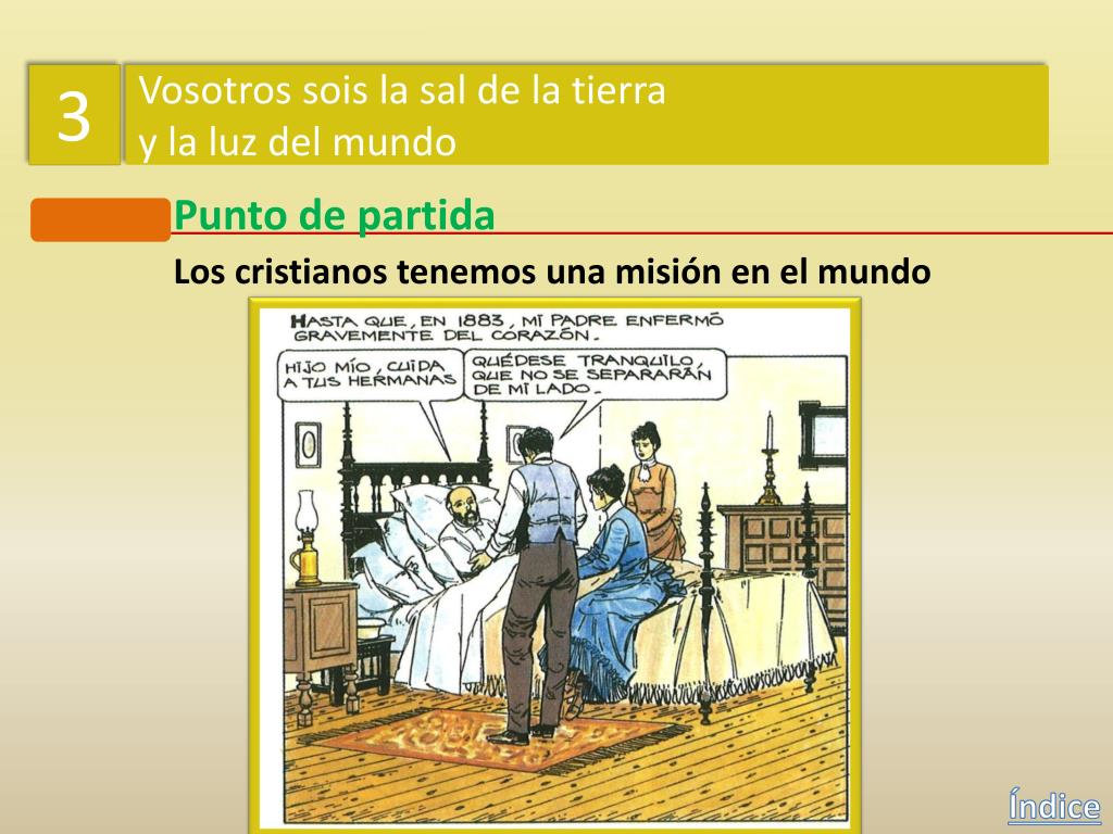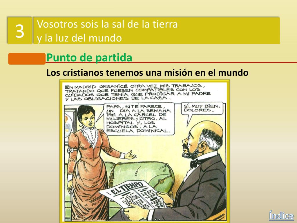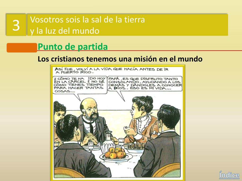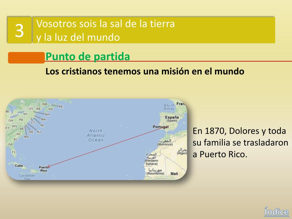 3 Vosotros sois la sal de la tierra y la luz del mundo Punto de partida Los cristianos tenemos una misión en el mundo En 1870, Dolores y toda su familia se trasladaron a Puerto Rico. Índice