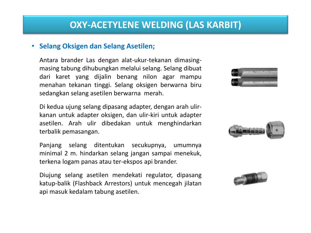 OXY-ACETYLENE WELDING (LAS KARBIT) Selang Oksigen dan Selang Asetilen; Antara brander Las dengan alat-ukur-tekanan dimasing-masing tabung dihubungkan melalui selang. Selang dibuat dari karet yang dijalin benang nilon agar mampu menahan tekanan tinggi. Selang oksigen berwarna biru sedangkan selang asetilen berwarna merah. Di kedua ujung selang dipasang adapter, dengan arah ulir-kanan untuk adapter oksigen, dan ulir-kiri untuk adapter asetilen. Arah ulir dibedakan untuk menghindarkan terbalik pemasangan. Panjang selang ditentukan secukupnya, umumnya minimal 2 m. hindarkan selang jangan sampai menekuk, terkena logam panas atau ter-ekspos api brander. Diujung selang asetilen mendekati regulator, dipasang katup-balik (Flashback Arrestors) untuk mencegah jilatan api masuk kedalam tabung asetilen.