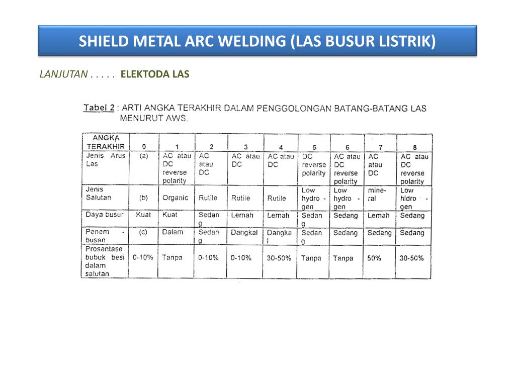 SHIELD METAL ARC WELDING (LAS BUSUR LISTRIK) LANJUTAN . . . . . ELEKTODA LAS