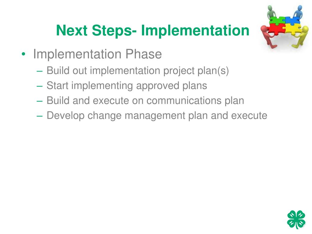 Next Steps- Implementation • Implementation Phase • Build out implementation project plan(s) • Start implementing approved plans • Build and execute on communications plan • Develop change management plan and execute