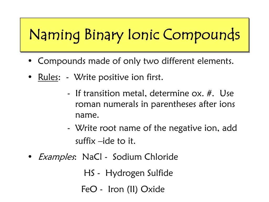 Naming Binary Ionic Compounds • Compounds made of only two different elements. • Rules: - Write positive ion first. • - If transition metal, determine ox. #. Use roman numerals in parentheses after ions name. • - Write root name of the negative ion, add • suffix –ide to it. • Examples: NaCl - Sodium Chloride • HS - Hydrogen Sulfide • FeO - Iron (II) Oxide