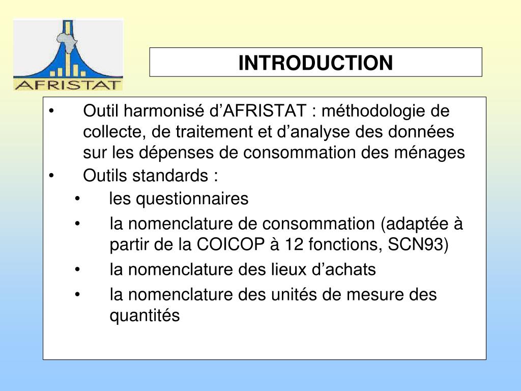 INTRODUCTION Outil harmonisé d’AFRISTAT : méthodologie de collecte, de traitement et d’analyse des données sur les dépenses de consommation des ménages Outils standards : les questionnaires la nomenclature de consommation (adaptée à partir de la COICOP à 12 fonctions, SCN93) la nomenclature des lieux d’achats la nomenclature des unités de mesure des quantités