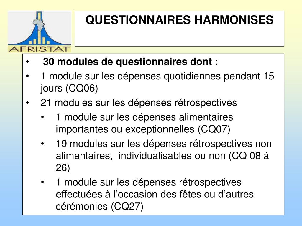 QUESTIONNAIRES HARMONISES 30 modules de questionnaires dont : 1 module sur les dépenses quotidiennes pendant 15 jours (CQ06) 21 modules sur les dépenses rétrospectives 1 module sur les dépenses alimentaires importantes ou exceptionnelles (CQ07) 19 modules sur les dépenses rétrospectives non alimentaires, individualisables ou non (CQ 08 à 26) 1 module sur les dépenses rétrospectives effectuées à l’occasion des fêtes ou d’autres cérémonies (CQ27)