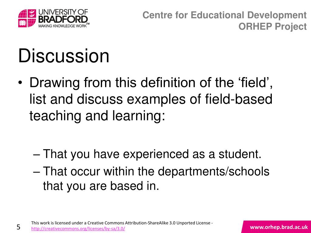 Discussion • Drawing from this definition of the ‘field’, list and discuss examples of field-based teaching and learning: • That you have experienced as a student. • That occur within the departments/schools that you are based in.