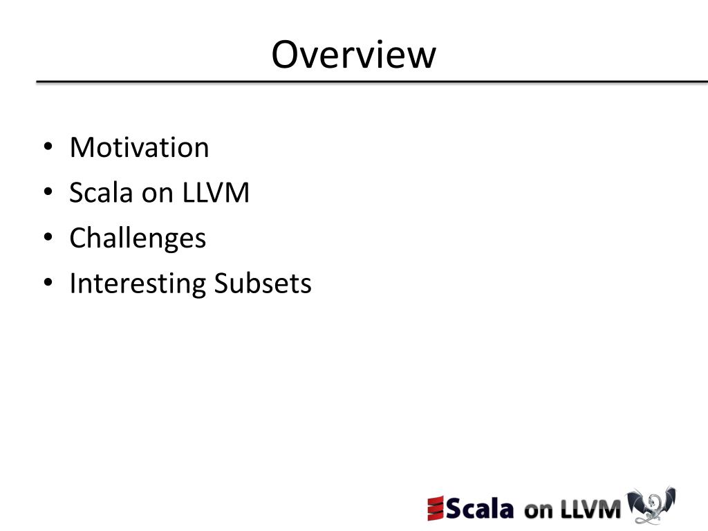 Overview • Motivation • Scala on LLVM • Challenges • Interesting Subsets