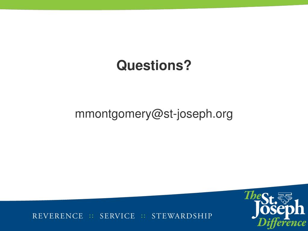 The Best Baldrige Things • Core competency-values based behavior • “The St Joseph Difference” • Customer Focus-patients and residents • Requirements-convenience, service, quality • Access- “Closer to Home” • Focus on excellence • Mission, vision • PI program