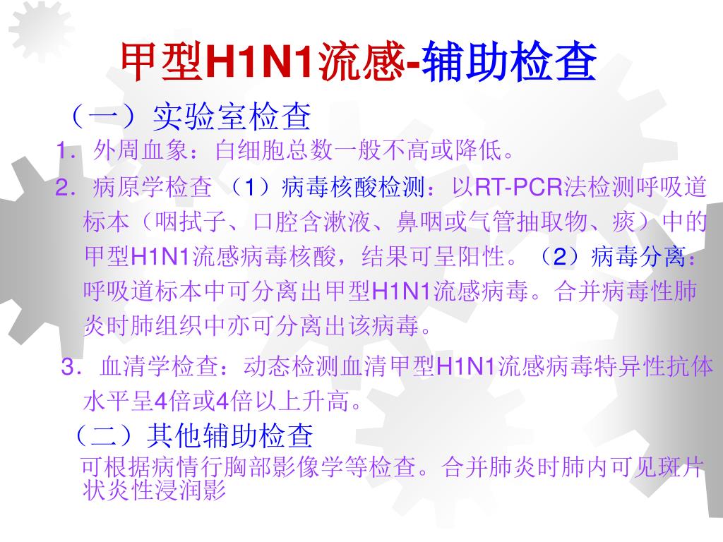 甲型H1N1流感-辅助检查 (一)实验室检查 1.外周血象:白细胞总数一般不高或降低。 2.病原学检查 (1)病毒核酸检测:以RT-PCR法检测呼吸道标本(咽拭子、口腔含漱液、鼻咽或气管抽取物、痰)中的甲型H1N1流感病毒核酸,结果可呈阳性。(2)病毒分离:呼吸道标本中可分离出甲型H1N1流感病毒。合并病毒性肺炎时肺组织中亦可分离出该病毒。 3.血清学检查:动态检测血清甲型H1N1流感病毒特异性抗体水平呈4倍或4倍以上升高。 (二)其他辅助检查 可根据病情行胸部影像学等检查。合并肺炎时肺内可见斑片状炎性浸润影