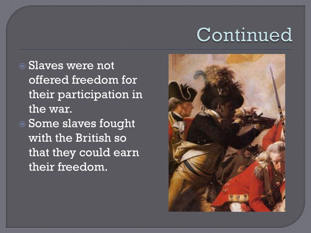 Continued • Slaves were not offered freedom for their participation in the war. • Some slaves fought with the British so that they could earn their freedom.