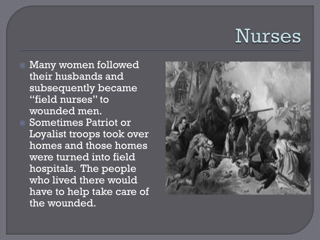 Nurses • Many women followed their husbands and subsequently became “field nurses” to wounded men. • Sometimes Patriot or Loyalist troops took over homes and those homes were turned into field hospitals. The people who lived there would have to help take care of the wounded.
