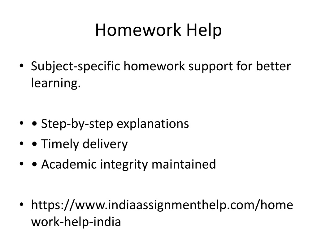 Homework Help • Subject-specific homework support for better learning. • • Step-by-step explanations • • Timely delivery • • Academic integrity maintained • https://www.indiaassignmenthelp.com/homework-help-india