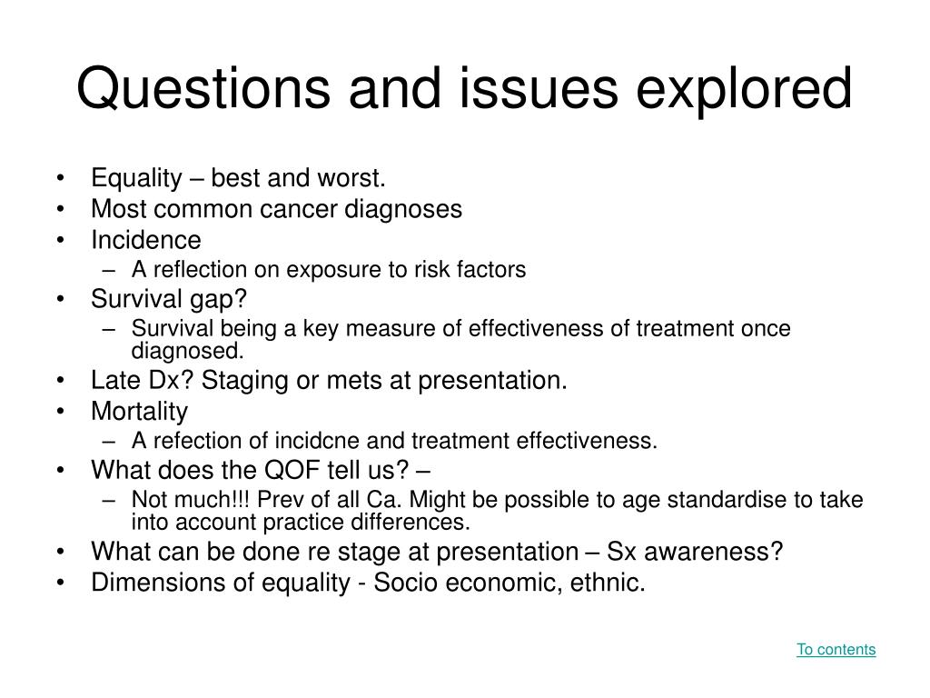 Questions and issues explored • Equality – best and worst. • Most common cancer diagnoses • Incidence • A reflection on exposure to risk factors • Survival gap? • Survival being a key measure of effectiveness of treatment once diagnosed. • Late Dx? Staging or mets at presentation. • Mortality • A refection of incidcne and treatment effectiveness. • What does the QOF tell us? – • Not much!!! Prev of all Ca. Might be possible to age standardise to take into account practice differences. • What can be done re stage at presentation – Sx awareness? • Dimensions of equality - Socio economic, ethnic. To contents