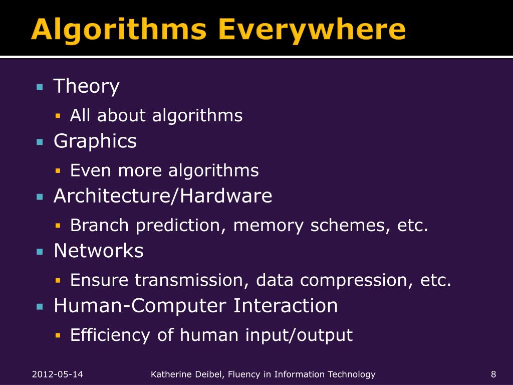 Algorithms Everywhere • Theory • All about algorithms • Graphics • Even more algorithms • Architecture/Hardware • Branch prediction, memory schemes, etc. • Networks • Ensure transmission, data compression, etc. • Human-Computer Interaction • Efficiency of human input/output Katherine Deibel, Fluency in Information Technology