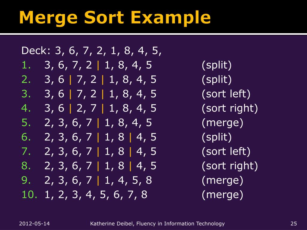 Merge Sort Example Deck: 3, 6, 7, 2, 1, 8, 4, 5, • 3, 6, 7, 2 | 1, 8, 4, 5 (split) • 3, 6 | 7, 2 | 1, 8, 4, 5 (split) • 3, 6 |7, 2| 1, 8, 4, 5 (sort left) • 3, 6 |2, 7 | 1, 8, 4, 5 (sort right) • 2, 3, 6, 7 | 1, 8, 4, 5 (merge) • 2, 3, 6, 7 | 1, 8 | 4, 5 (split) • 2, 3, 6, 7 | 1, 8 | 4, 5 (sort left) • 2, 3, 6, 7 | 1, 8 | 4, 5 (sort right) • 2, 3, 6, 7 | 1, 4, 5, 8 (merge) • 1, 2, 3, 4, 5, 6, 7, 8 (merge) Katherine Deibel, Fluency in Information Technology
