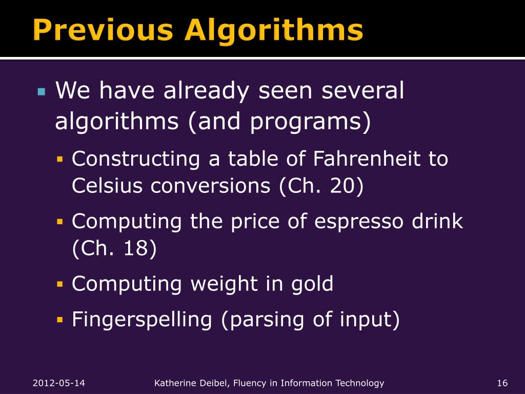 Previous Algorithms • We have already seen several algorithms (and programs) • Constructing a table of Fahrenheit to Celsius conversions (Ch. 20) • Computing the price of espresso drink (Ch. 18) • Computing weight in gold • Fingerspelling (parsing of input) Katherine Deibel, Fluency in Information Technology