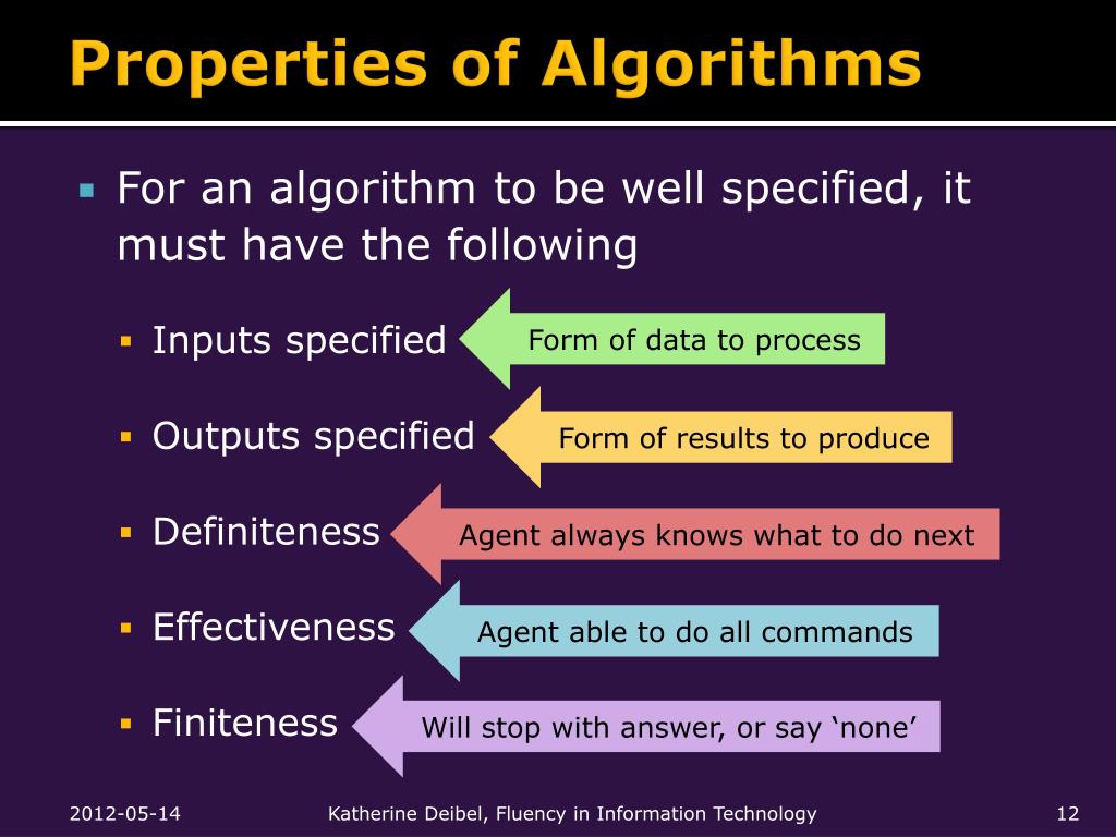 Properties of Algorithms • For an algorithm to be well specified, it must have the following • Inputs specified • Outputs specified • Definiteness • Effectiveness • Finiteness Form of data to process Form of results to produce Agent always knows what to do next Agent able to do all commands Will stop with answer, or say ‘none’ Katherine Deibel, Fluency in Information Technology