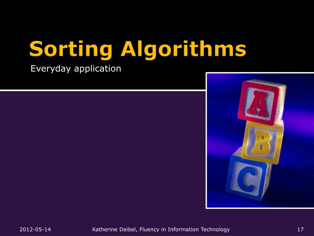 Sorting Algorithms Everyday application Katherine Deibel, Fluency in Information Technology
