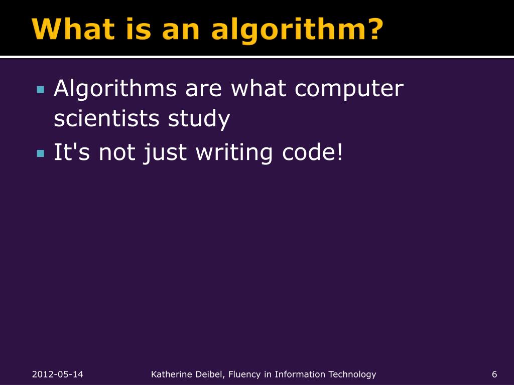 What is an algorithm? • Algorithms are what computer scientists study • It's not just writing code! Katherine Deibel, Fluency in Information Technology