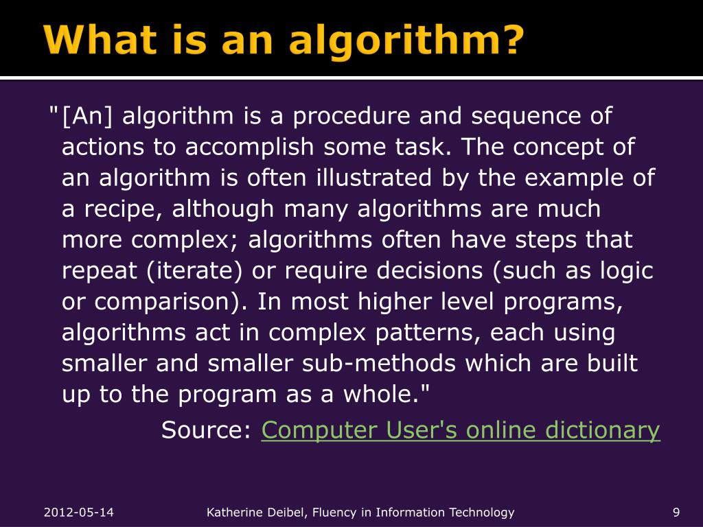 What is an algorithm? " [An] algorithm is a procedure and sequence of actions to accomplish some task. The concept of an algorithm is often illustrated by the example of a recipe, although many algorithms are much more complex; algorithms often have steps that repeat (iterate) or require decisions (such as logic or comparison). In most higher level programs, algorithms act in complex patterns, each using smaller and smaller sub-methods which are built up to the program as a whole." Source: Computer User's online dictionary Katherine Deibel, Fluency in Information Technology