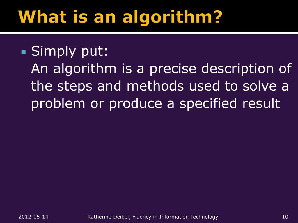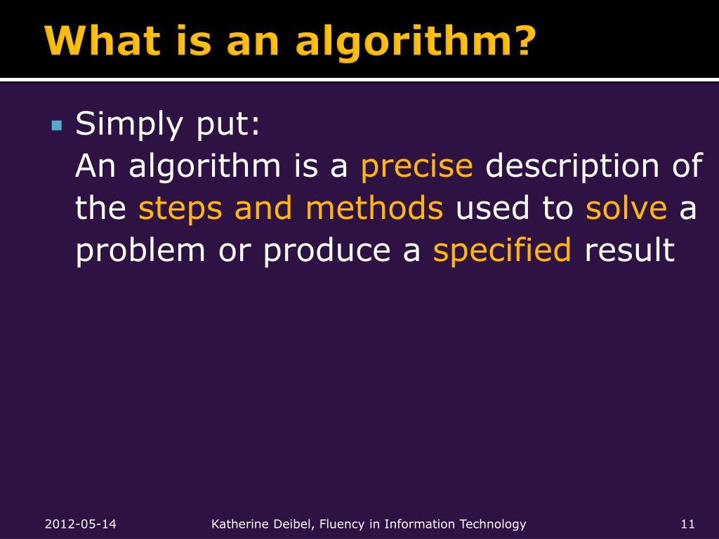 What is an algorithm? • Simply put:An algorithm is a precise description of the steps and methods used to solve a problem or produce a specified result Katherine Deibel, Fluency in Information Technology