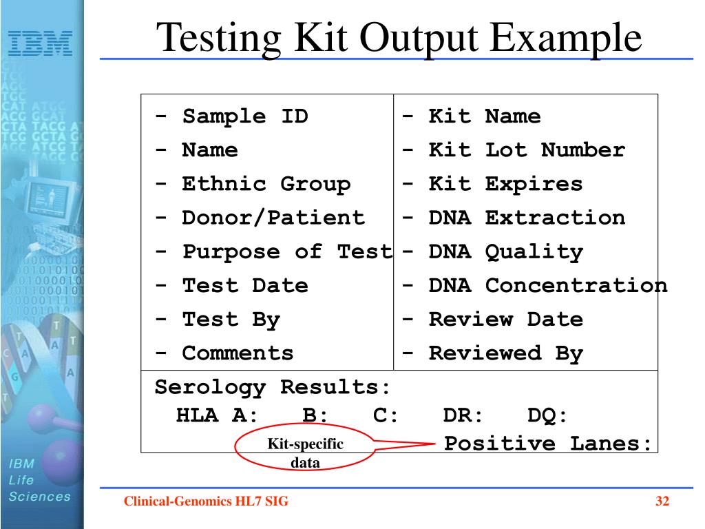 Testing Kit Output Example - Sample ID - Kit Name - Name - Kit Lot Number - Ethnic Group - Kit Expires - Donor/Patient - DNA Extraction - Purpose of Test - DNA Quality - Test Date - DNA Concentration - Test By - Review Date - Comments - Reviewed By Serology Results:HLA A: B: C: DR: DQ: Positive Lanes: Kit-specific data