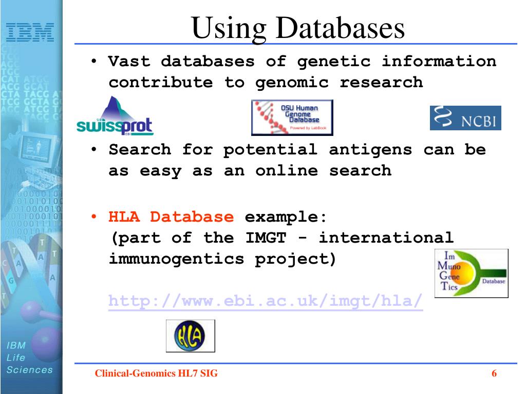 Using Databases • Vast databases of genetic information contribute to genomic research • Search for potential antigens can be as easy as an online search • HLA Database example: (part of the IMGT - international immunogentics project) http://www.ebi.ac.uk/imgt/hla/