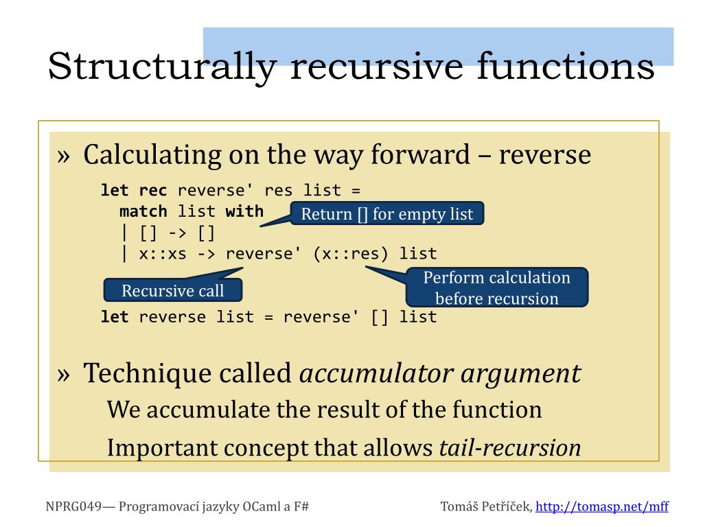 Structurally recursive functions • Calculating on the way forward – reverse • Technique called accumulator argument We accumulate the result of the function Important concept that allows tail-recursion let recreverse' res list = match list with | [] -> [] | x::xs -> reverse' (x::res) list let reverse list = reverse' [] list Return [] for empty list Perform calculation before recursion Recursive call