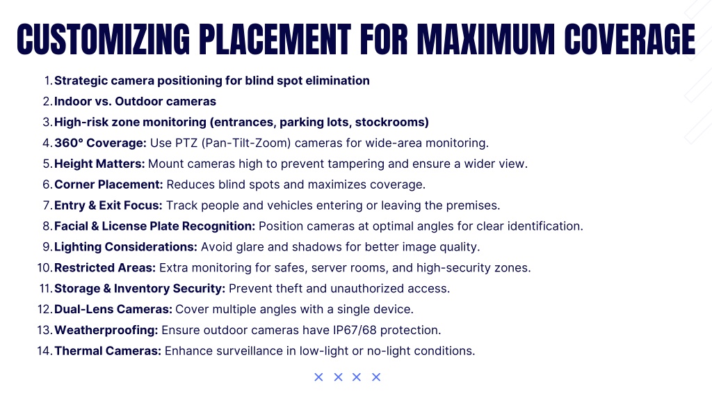 CUSTOMIZING PLACEMENT FOR MAXIMUM COVERAGE 1.Strategic camera positioning for blind spot elimination 2.Indoor vs. Outdoor cameras 3.High-risk zone monitoring (entrances, parking lots, stockrooms) 4.360° Coverage: Use PTZ (Pan-Tilt-Zoom) cameras for wide-area monitoring. 5.Height Matters: Mount cameras high to prevent tampering and ensure a wider view. 6.Corner Placement: Reduces blind spots and maximizes coverage. 7.Entry & Exit Focus: Track people and vehicles entering or leaving the premises. 8.Facial & License Plate Recognition: Position cameras at optimal angles for clear identification. 9.Lighting Considerations: Avoid glare and shadows for better image quality. 10.Restricted Areas: Extra monitoring for safes, server rooms, and high-security zones. 11.Storage & Inventory Security: Prevent theft and unauthorized access. 12.Dual-Lens Cameras: Cover multiple angles with a single device. 13.Weatherproofing: Ensure outdoor cameras have IP67/68 protection. 14.Thermal Cameras: Enhance surveillance in low-light or no-light conditions.