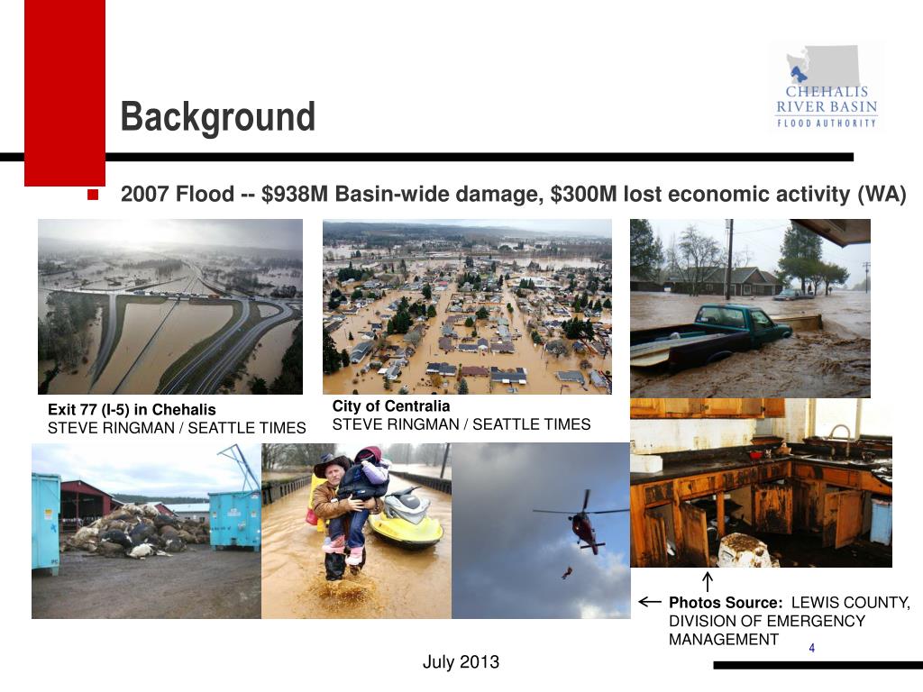 Background • 2007 Flood -- $938M Basin-wide damage, $300M lost economic activity (WA) City of Centralia STEVE RINGMAN / SEATTLE TIMES Exit 77 (I-5) in Chehalis STEVE RINGMAN / SEATTLE TIMES Photos Source: LEWIS COUNTY, DIVISION OF EMERGENCY MANAGEMENT July 2013