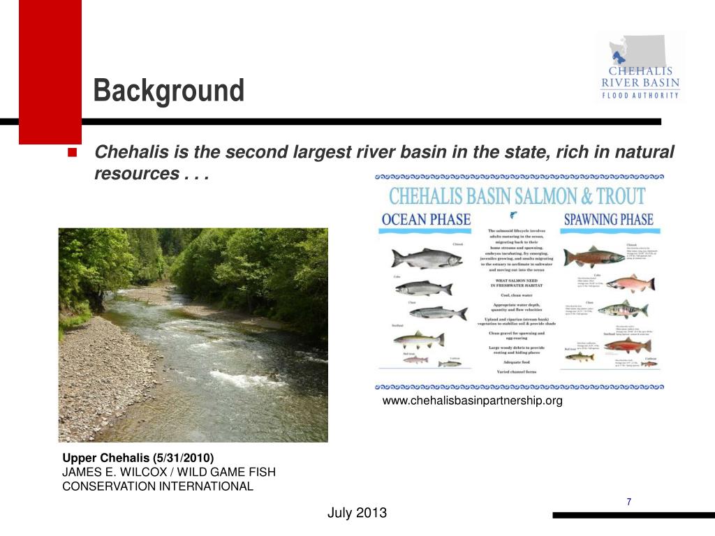 Background • Chehalis is the second largest river basin in the state, rich in natural resources . . . www.chehalisbasinpartnership.org Upper Chehalis (5/31/2010) JAMES E. WILCOX / WILD GAME FISH CONSERVATION INTERNATIONAL July 2013
