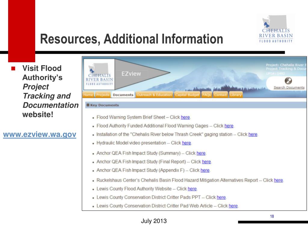 Resources, Additional Information • Visit Flood Authority’s Project Tracking and Documentation website! www.ezview.wa.gov July 2013