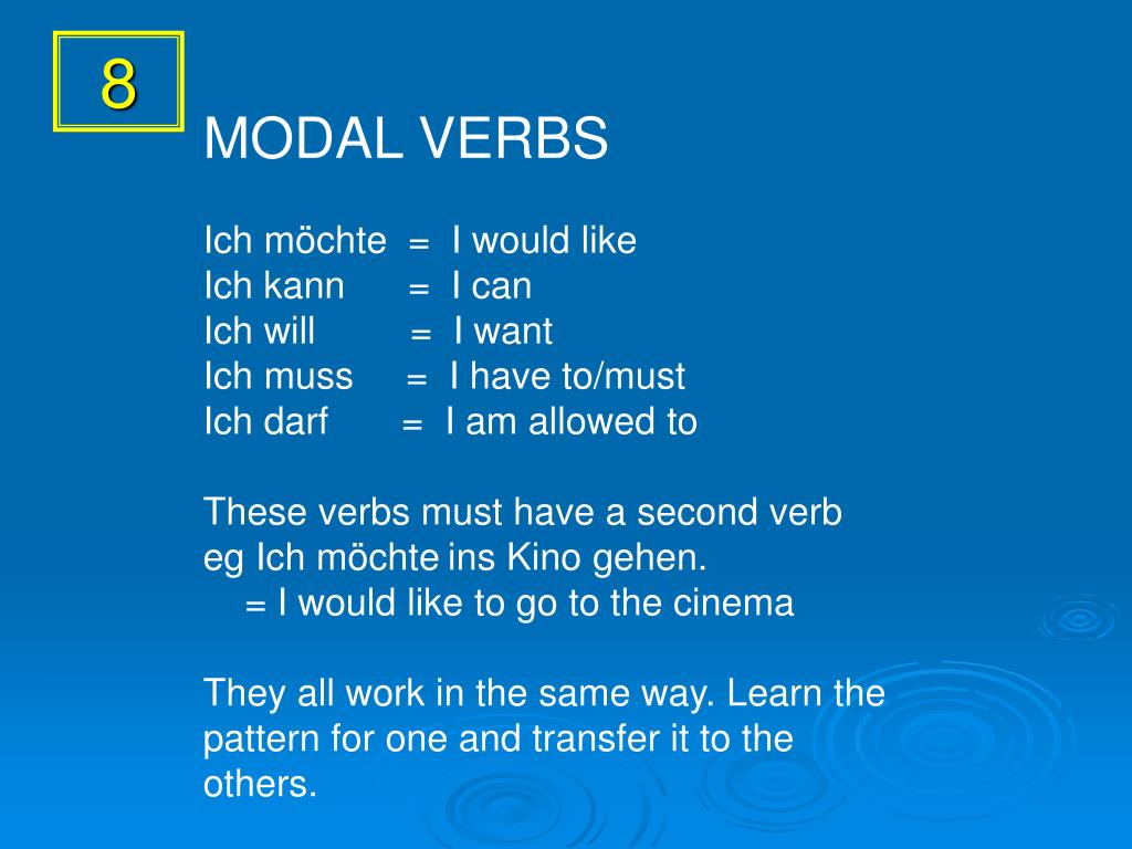 8 MODAL VERBS Ich möchte = I would like Ich kann = I can Ich will = I want Ich muss = I have to/must Ich darf = I am allowed to These verbs must have a second verb eg Ich möchteins Kino gehen. = I would like to go to the cinema They all work in the same way. Learn the pattern for one and transfer it to the others.