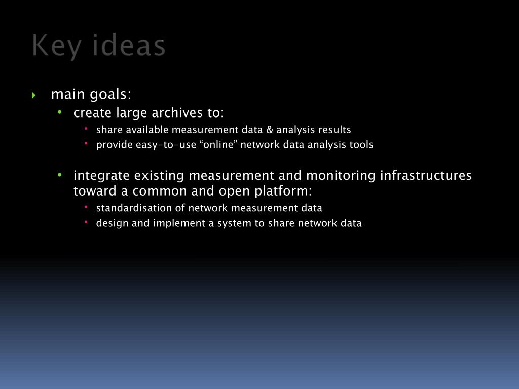main goals: • create large archives to: • share available measurement data & analysis results • provide easy-to-use “online” network data analysistools • integrate existing measurement and monitoring infrastructures toward a common and open platform: • standardisation of network measurement data • design and implement a system to share network data