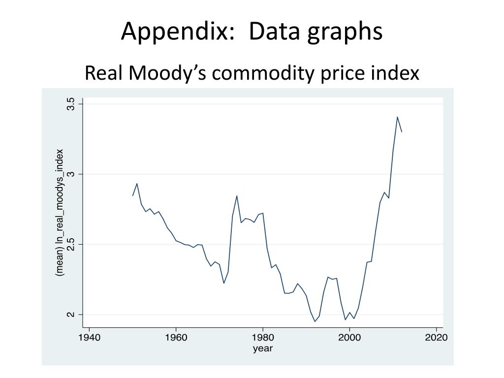 Estimation of determination for real prices,commodity-by-commodity, 1950-2012, continued *** p<0.01, ** p<0.05, * p<0.1 (Robust standard errors in parentheses.) † Some commodities have shorter sample periods.