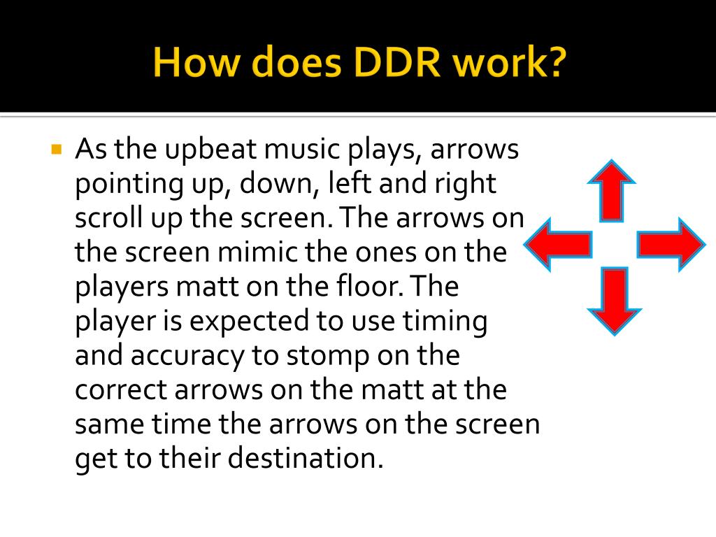 How does DDR work? • As the upbeat music plays, arrows pointing up, down, left and right scroll up the screen. The arrows on the screen mimic the ones on the players matt on the floor. The player is expected to use timing and accuracy to stomp on the correct arrows on the matt at the same time the arrows on the screen get to their destination.