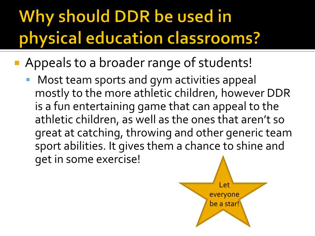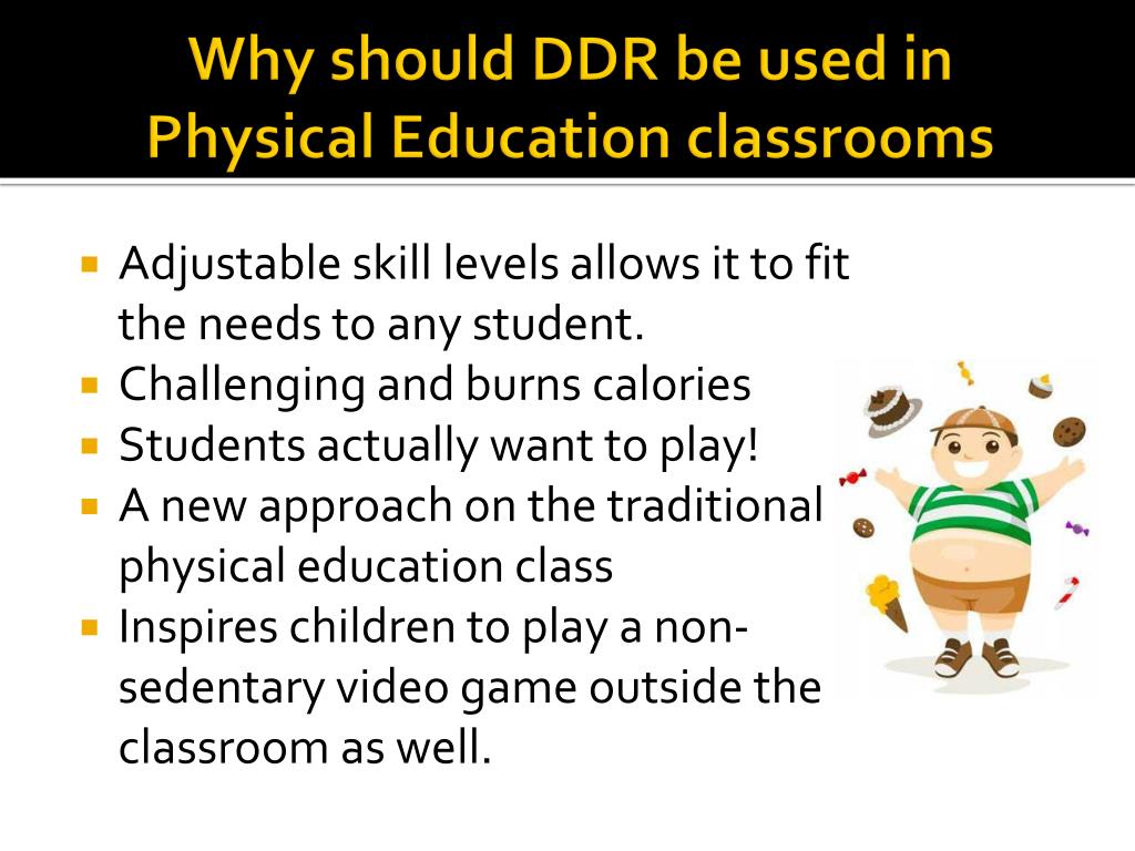 Why should DDR be used in physical education classrooms? • Appeals to a broader range of students! • Most team sports and gym activities appeal mostly to the more athletic children, however DDR is a fun entertaining game that can appeal to the athletic children, as well as the ones that aren’t so great at catching, throwing and other generic team sport abilities. It gives them a chance to shine and get in some exercise! Let everyone be a star!