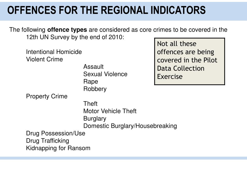 OFFENCES FOR THE REGIONAL INDICATORS • The following offence types are considered as core crimes to be covered in the 12th UN Survey by the end of 2010: • Intentional Homicide • Violent Crime • Assault • Sexual Violence • Rape • Robbery • Property Crime • Theft • Motor Vehicle Theft • Burglary • Domestic Burglary/Housebreaking • Drug Possession/Use • Drug Trafficking • Kidnapping for Ransom