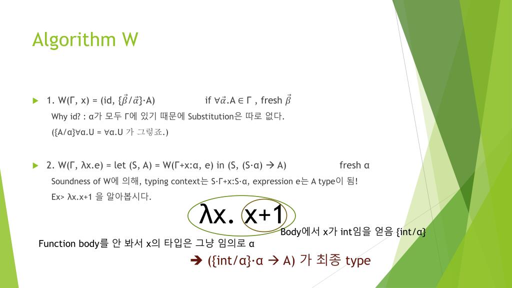 Algorithm W • 1. W(Γ, x) = (id, {/}·A) if ∀.A ∈ Γ , fresh Why id? : α가 모두 Γ에 있기 때문에 Substitution은 따로 없다. ({A/α}∀α.U = ∀α.U 가 그렇죠.) • 2. W(Γ, λx.e) = let (S, A) = W(Γ+x:α, e) in (S, (S·α) A) fresh α Soundness of W에 의해, typing context는 S·Γ+x:S·α, expression e는 A type이 됨! Ex> λx.x+1 을 알아봅시다. λx. x+1 Body에서 x가 int임을 얻음 {int/α} Function body를 안 봐서 x의 타입은 그냥 임의로 α ({int/α}·αA) 가 최종 type