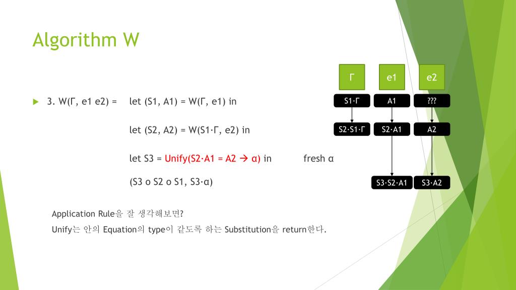 Algorithm W Γ e1 e2 • 3. W(Γ, e1 e2) = let (S1, A1) = W(Γ, e1) in let (S2, A2) = W(S1·Γ, e2) in let S3 = Unify(S2·A1 = A2 α) in fresh α (S3 o S2 o S1, S3·α) Application Rule을 잘 생각해보면? Unify는 안의 Equation의 type이 같도록 하는 Substitution을 return한다. ??? A1 S1·Γ A2 S2·A1 S2·S1·Γ S3·S2·A1 S3·A2