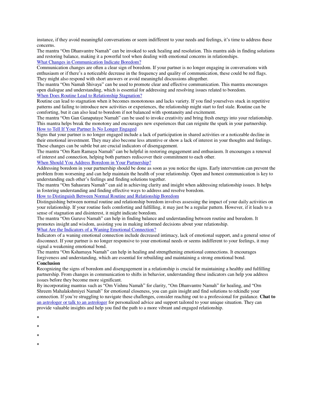 instance, if they avoid meaningful conversations or seem indifferent to your needs and feelings, it’s time to address these concerns. The mantra “Om Dhanvantre Namah” can be invoked to seek healing and resolution. This mantra aids in finding solutions and restoring balance, making it a powerful tool when dealing with emotional concerns in relationships. What Changes in Communication Indicate Boredom? Communication changes are often a clear sign of boredom. If your partner is no longer engaging in conversations with enthusiasm or if there’s a noticeable decrease in the frequency and quality of communication, these could be red flags. They might also respond with short answers or avoid meaningful discussions altogether. The mantra “Om Namah Shivaya” can be used to promote clear and effective communication. This mantra encourages open dialogue and understanding, which is essential for addressing and resolving issues related to boredom. When Does Routine Lead to Relationship Stagnation? Routine can lead to stagnation when it becomes monotonous and lacks variety. If you find yourselves stuck in repetitive patterns and failing to introduce new activities or experiences, the relationship might start to feel stale. Routine can be comforting, but it can also lead to boredom if not balanced with spontaneity and excitement. The mantra “Om Gan Ganapataye Namah” can be used to invoke creativity and bring fresh energy into your relationship. This mantra helps break the monotony and encourages new experiences that can reignite the spark in your partnership. How to Tell If Your Partner Is No Longer Engaged Signs that your partner is no longer engaged include a lack of participation in shared activities or a noticeable decline in their emotional investment. They may also become less attentive or show a lack of interest in your thoughts and feelings. These changes can be subtle but are crucial indicators of disengagement. The mantra “Om Ram Ramaya Namah” can be helpful in restoring engagement and enthusiasm. It encourages a renewal of interest and connection, helping both partners rediscover their commitment to each other. When Should You Address Boredom in Your Partnership? Addressing boredom in your partnership should be done as soon as you notice the signs. Early intervention can prevent the problem from worsening and can help maintain the health of your relationship. Open and honest communication is key to understanding each other’s feelings and finding solutions together. The mantra “Om Sahasrara Namah” can aid in achieving clarity and insight when addressing relationship issues. It helps in fostering understanding and finding effective ways to address and resolve boredom. How to Distinguish Between Normal Routine and Relationship Boredom Distinguishing between normal routine and relationship boredom involves assessing the impact of your daily activities on your relationship. If your routine feels comforting and fulfilling, it may just be a regular pattern. However, if it leads to a sense of stagnation and disinterest, it might indicate boredom. The mantra “Om Guruve Namah” can help in finding balance and understanding between routine and boredom. It promotes insight and wisdom, assisting you in making informed decisions about your relationship. What Are the Indicators of a Waning Emotional Connection? Indicators of a waning emotional connection include decreased intimacy, lack of emotional support, and a general sense of disconnect. If your partner is no longer responsive to your emotional needs or seems indifferent to your feelings, it may signal a weakening emotional bond. The mantra “Om Kshamaya Namah” can help in healing and strengthening emotional connections. It encourages forgiveness and understanding, which are essential for rebuilding and maintaining a strong emotional bond. Conclusion Recognizing the signs of boredom and disengagement in a relationship is crucial for maintaining a healthy and fulfilling partnership. From changes in communication to shifts in behavior, understanding these indicators can help you address issues before they become more significant. By incorporating mantras such as “Om Vishnu Namah” for clarity, “Om Dhanvantre Namah” for healing, and “Om Shreem Mahalakshmiyei Namah” for emotional closeness, you can gain insight and find solutions to rekindle your connection. If you’re struggling to navigate these challenges, consider reaching out to a professional for guidance. Chat to an astrologer or talk to an astrologer for personalized advice and support tailored to your unique situation. They can provide valuable insights and help you find the path to a more vibrant and engaged relationship.
