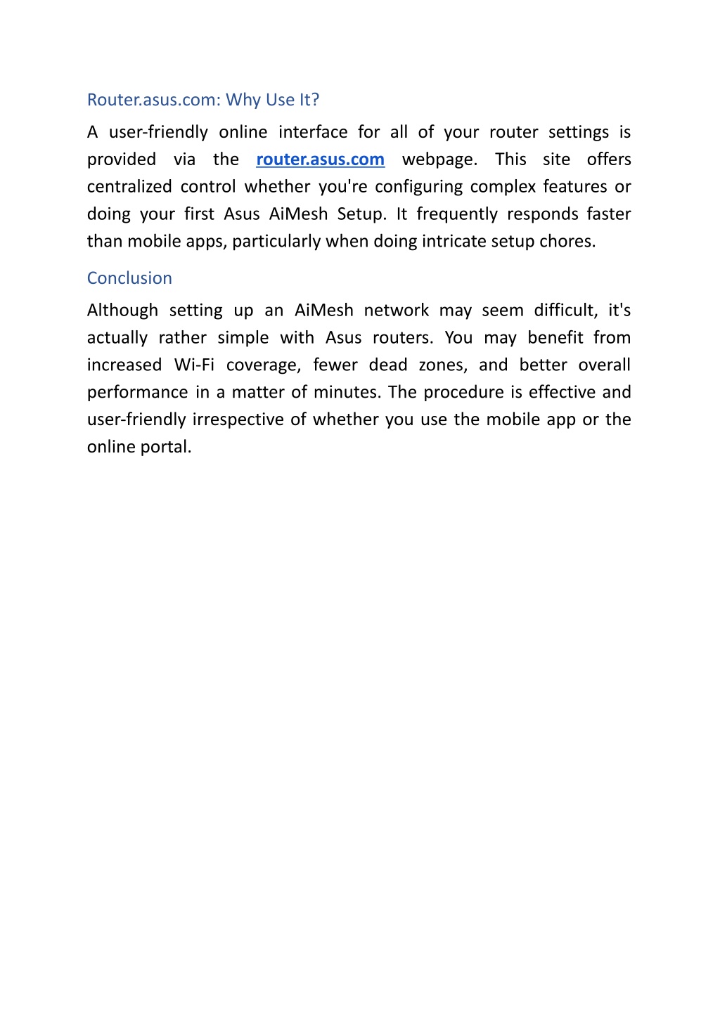 Router.asus.com: Why Use It? A user-friendly online interface for all of your router settings is provided via the router.asus.com webpage. This site offers centralized control whether you're configuring complex features or doing your first Asus AiMesh Setup. It frequently responds faster than mobile apps, particularly when doing intricate setup chores. Conclusion Although setting up an AiMesh network may seem difficult, it's actually rather simple with Asus routers. You may benefit from increased Wi-Fi coverage, fewer dead zones, and better overall performance in a matter of minutes. The procedure is effective and user-friendly irrespective of whether you use the mobile app or the online portal.