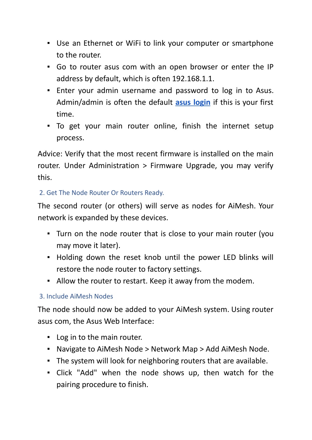 ▪ Use an Ethernet or WiFi to link your computer or smartphone to the router. ▪ Go to router asus com with an open browser or enter the IP address by default, which is often 192.168.1.1. ▪ Enter your admin username and password to log in to Asus. Admin/admin is often the default asus login if this is your first time. ▪ To get your main router online, finish the internet setup process. Advice: Verify that the most recent firmware is installed on the main router. Under Administration > Firmware Upgrade, you may verify this. 2. Get The Node Router Or Routers Ready. The second router (or others) will serve as nodes for AiMesh. Your network is expanded by these devices. ▪ Turn on the node router that is close to your main router (you may move it later). ▪ Holding down the reset knob until the power LED blinks will restore the node router to factory settings. ▪ Allow the router to restart. Keep it away from the modem. 3. Include AiMesh Nodes The node should now be added to your AiMesh system. Using router asus com, the Asus Web Interface: ▪ Log in to the main router. ▪ Navigate to AiMesh Node > Network Map > Add AiMesh Node. ▪ The system will look for neighboring routers that are available. ▪ Click "Add" when the node shows up, then watch for the pairing procedure to finish.