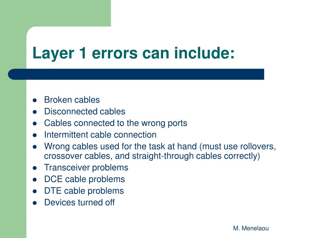 Layer 1 errors can include: • Broken cables • Disconnected cables • Cables connected to the wrong ports • Intermittent cable connection • Wrong cables used for the task at hand (must use rollovers, crossover cables, and straight-through cables correctly) • Transceiver problems • DCE cable problems • DTE cable problems • Devices turned off M. Menelaou
