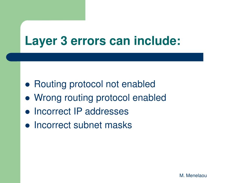 Layer 3 errors can include: • Routing protocol not enabled • Wrong routing protocol enabled • Incorrect IP addresses • Incorrect subnet masks M. Menelaou