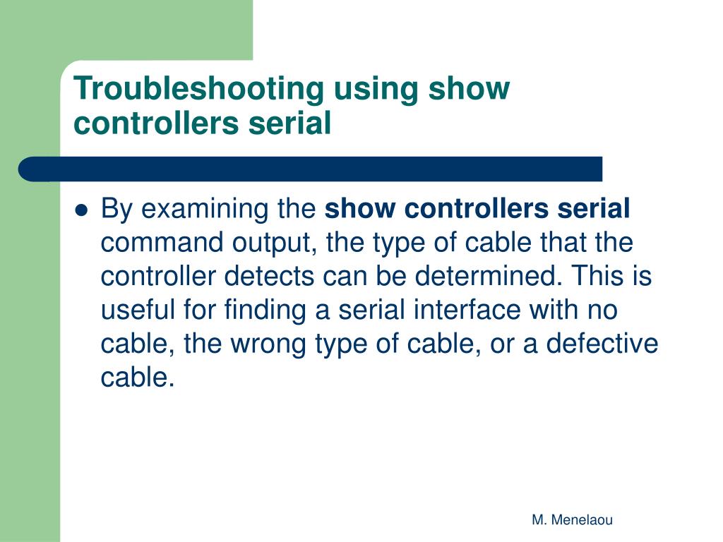 Troubleshooting using show controllers serial • By examining the show controllers serial command output, the type of cable that the controller detects can be determined. This is useful for finding a serial interface with no cable, the wrong type of cable, or a defective cable. M. Menelaou