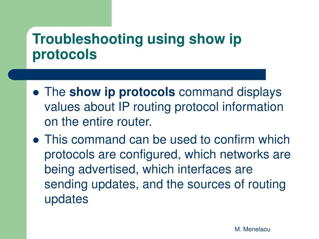 Troubleshooting using show ip protocols • The show ip protocols command displays values about IP routing protocol information on the entire router. • This command can be used to confirm which protocols are configured, which networks are being advertised, which interfaces are sending updates, and the sources of routing updates M. Menelaou
