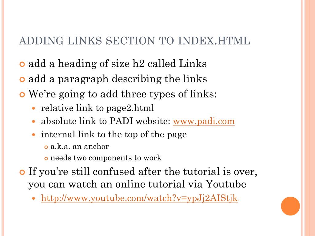 adding links section to index.html • add a heading of size h2 called Links • add a paragraph describing the links • We’re going to add three types of links: • relative link to page2.html • absolute link to PADI website: www.padi.com • internal link to the top of the page • a.k.a. an anchor • needs two components to work • If you’re still confused after the tutorial is over, you can watch an online tutorial via Youtube • http://www.youtube.com/watch?v=ypJj2AIStjk