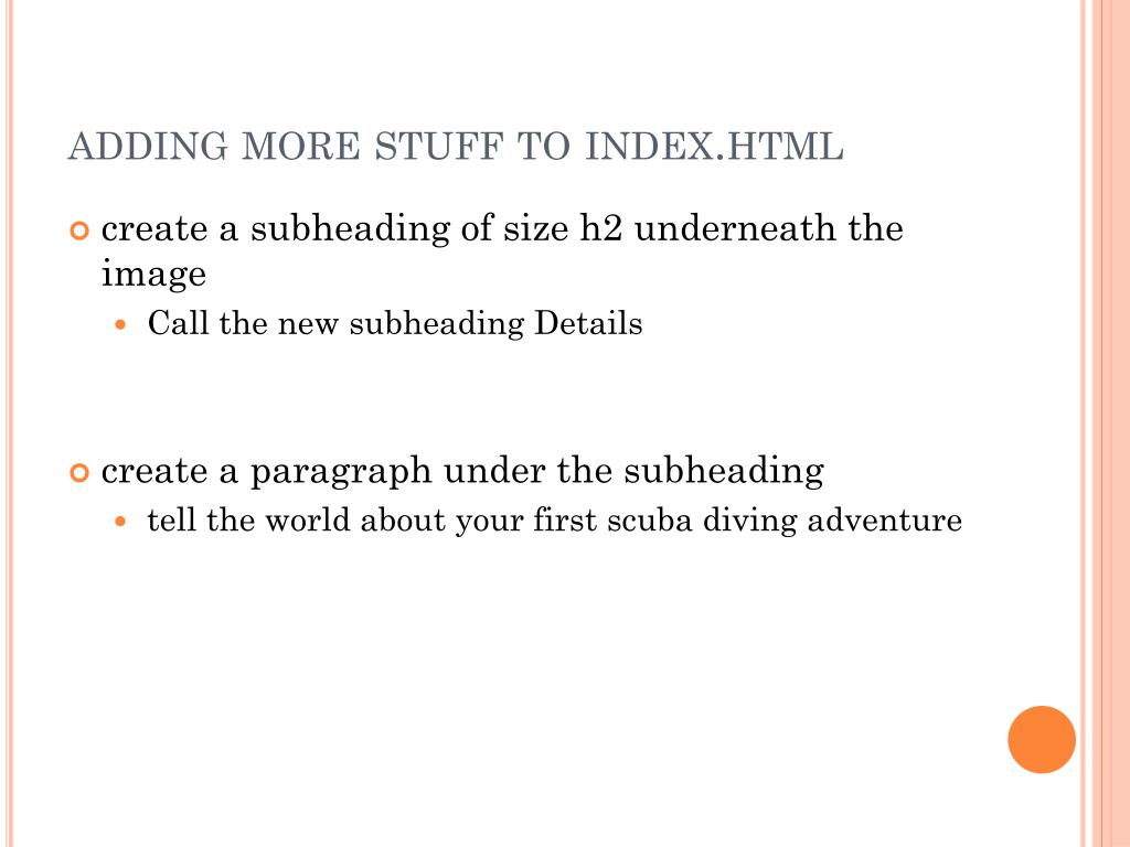 adding more stuff to index.html • create a subheading of size h2 underneath the image • Call the new subheading Details • create a paragraph under the subheading • tell the world about your first scuba diving adventure